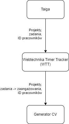 Oprogramowanie to łączy również wewnętrzny generator CV. Po wybraniu stosownej opcji przez administratora, następuje pobranie projektów i zadań z Time Trackera. Zadania są zapisywane w formie zaangażowania pracownika podczas pracy przy danym projekcie, jeśli ono jeszcze nie istnieje. W przeciwnym wypadku dane nie są nadpisywane w celu uniknięcia konfliktów i utraty wcześniej dodanych informacji na temat danego projektu.